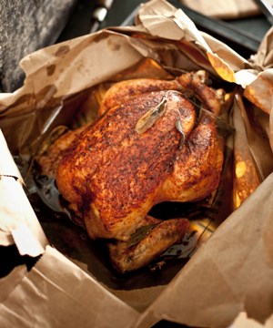Insert the turkey into an old fashioned brown paper grocery bag. (Do not oil the bag).